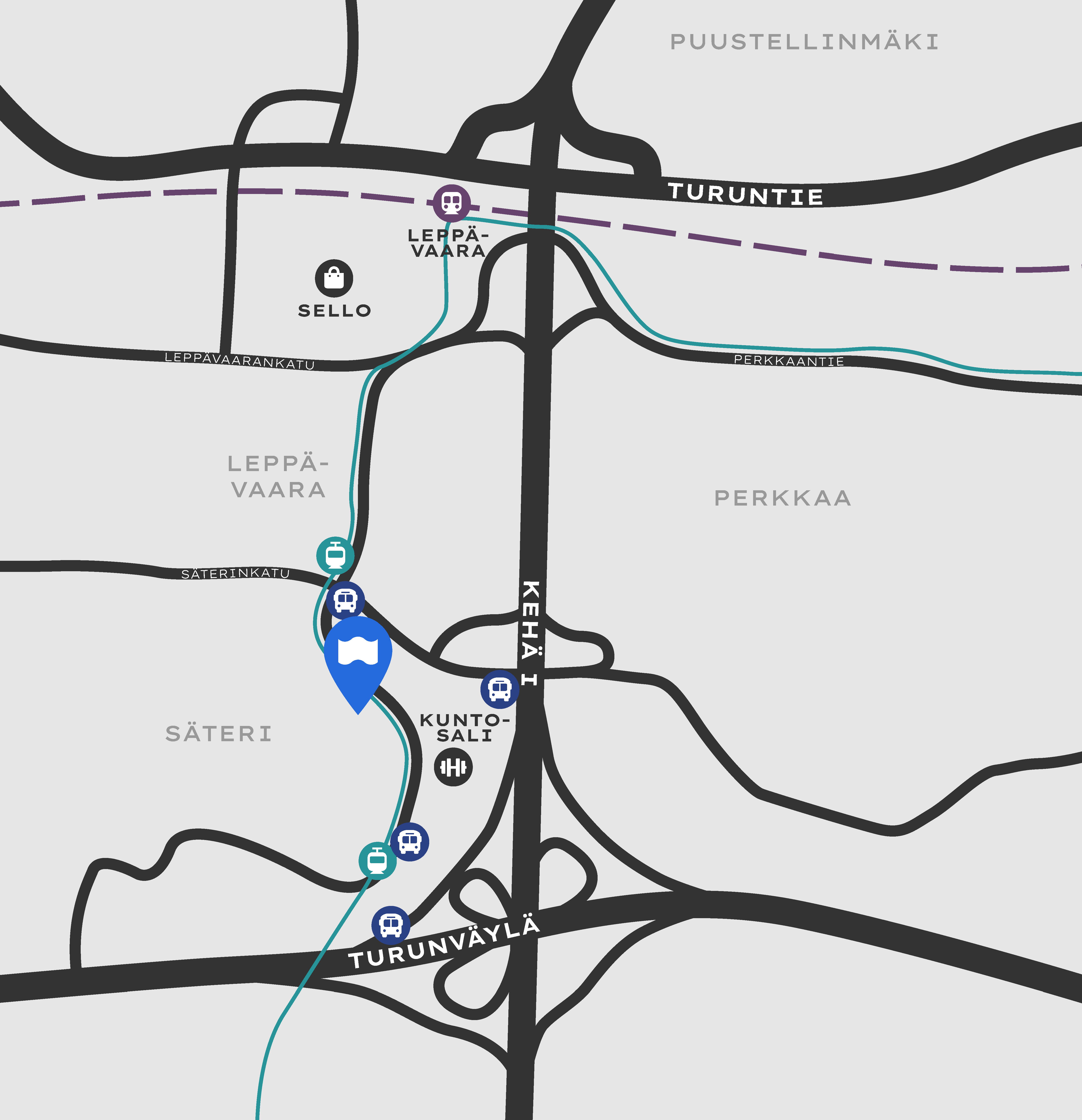 Sijainti lähellä Turunväylän ja Kehä I:n liittymää sekä Leppävaaran juna-asemaa ja Pikaratikan pysäkkiä takaa sujuvat yhteydet niin työntekijöille kuin asiakkaillekin.
